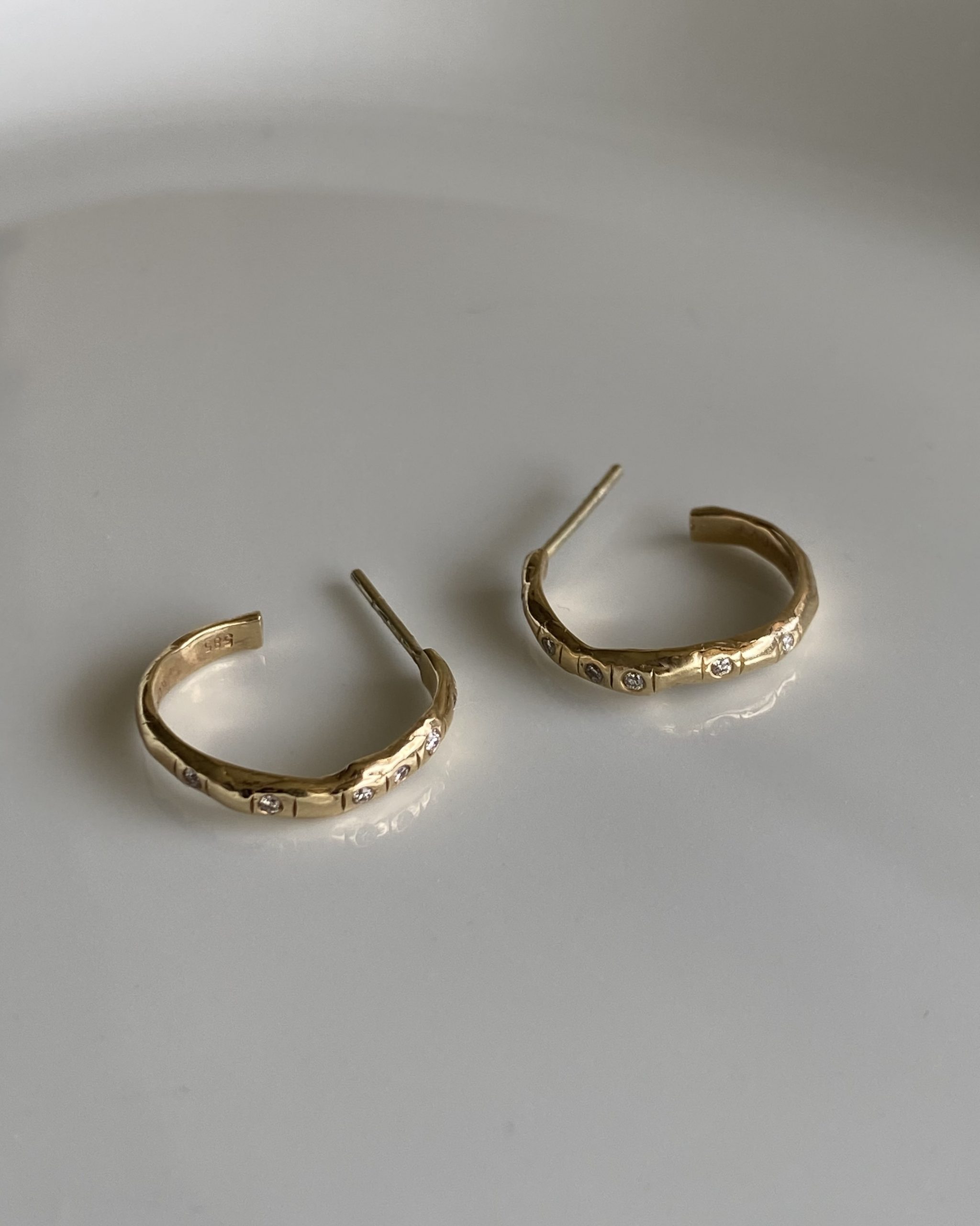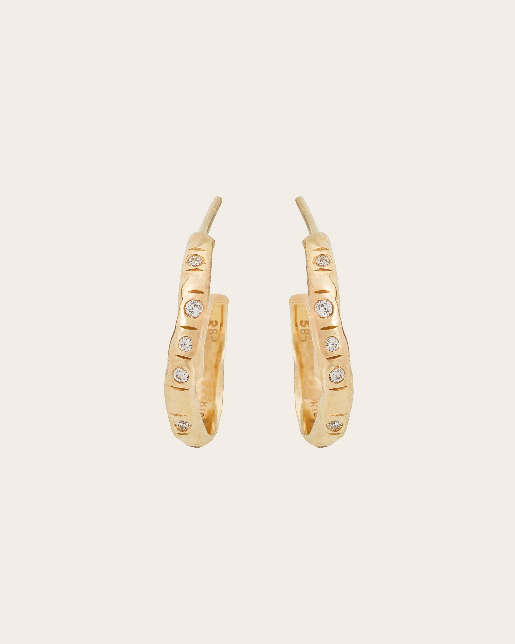 Brilliant Duna Hoop Earrings in flowing 14k gold, set with six 1.2mm brilliant-cut diamonds, twelve per pair. A refined, sculptural pair that catches light with subtle movement.