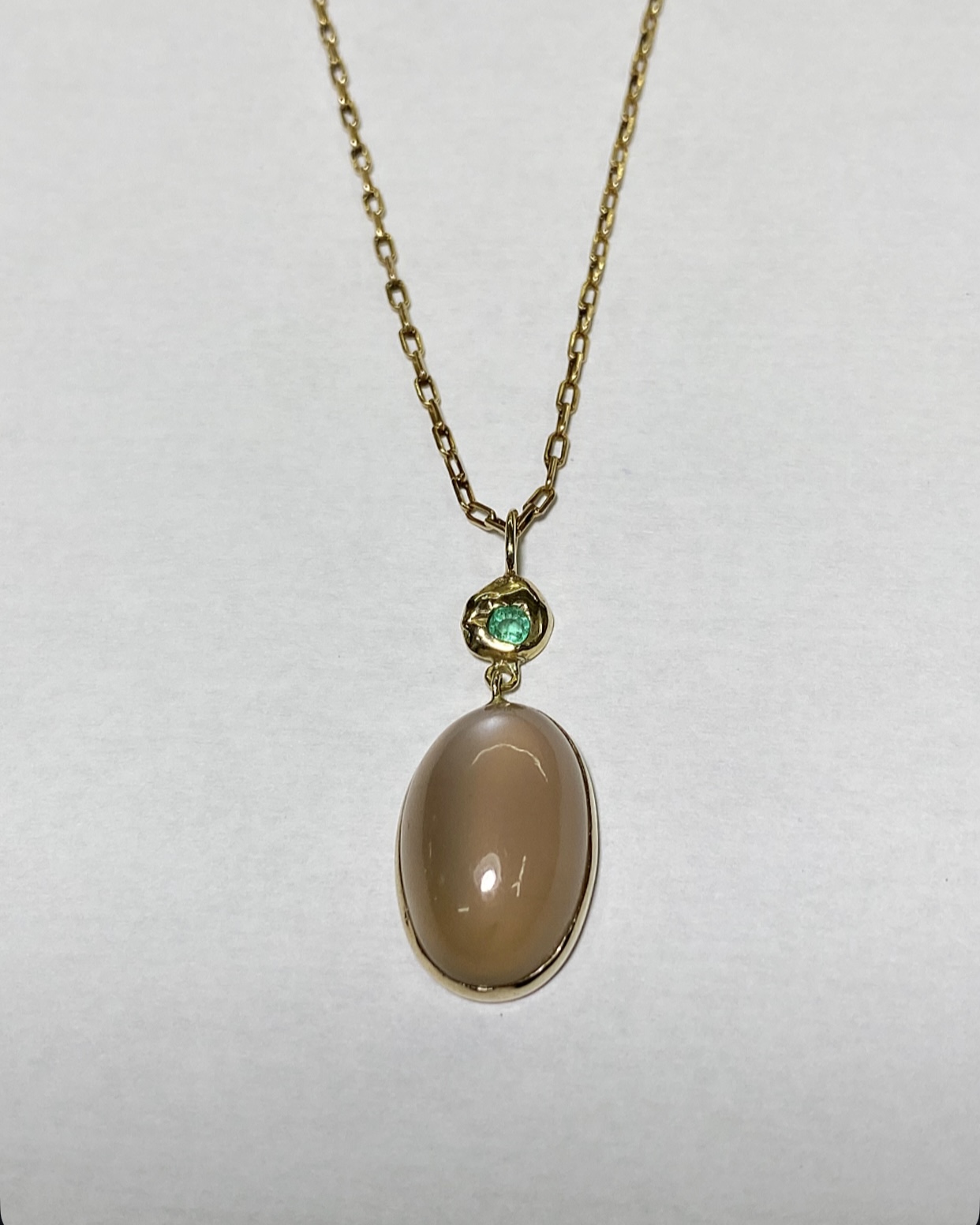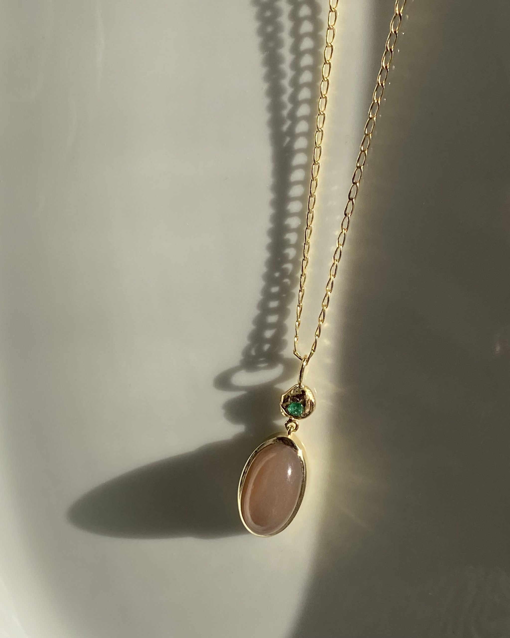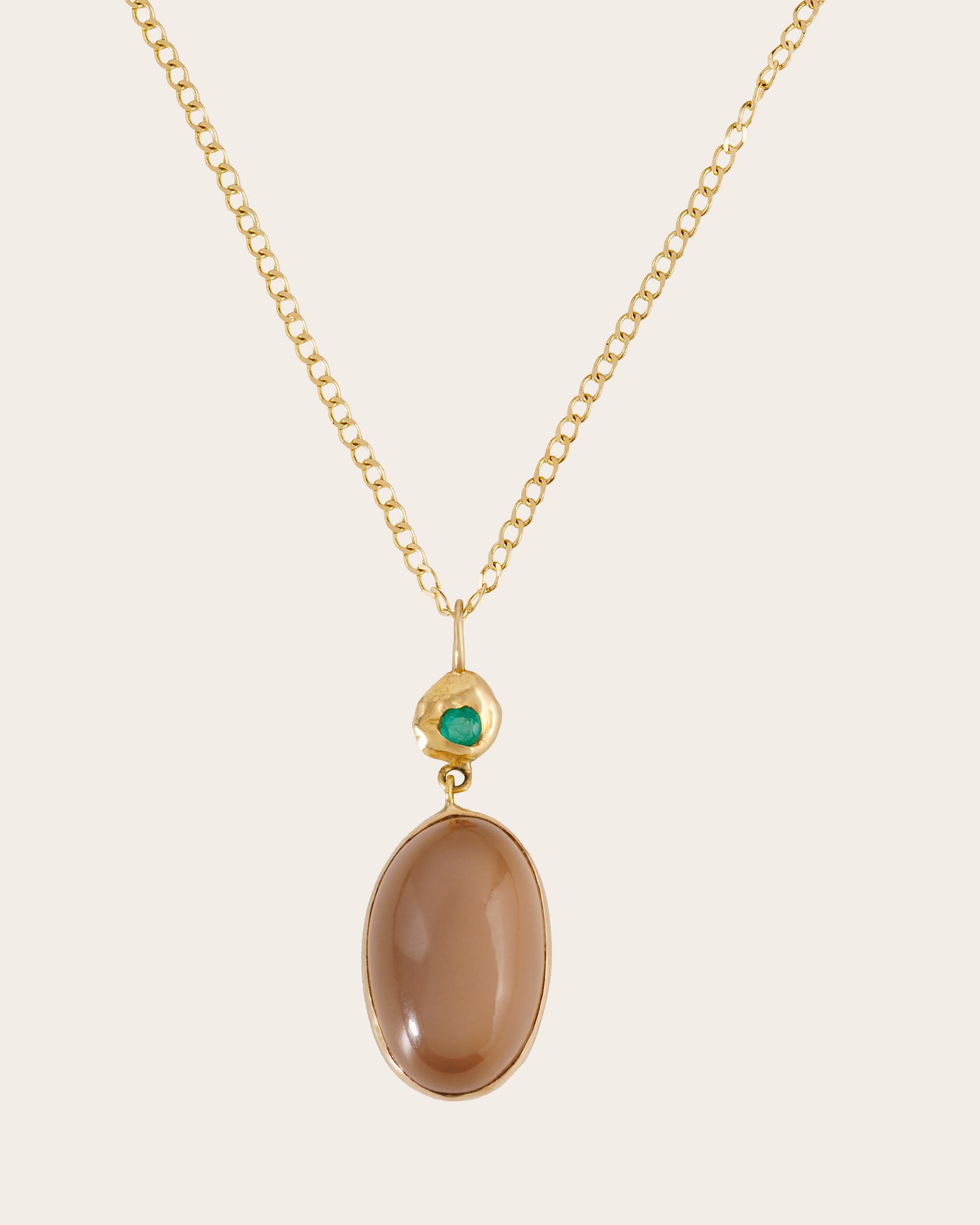 One-of-a-kind hand-fabricated pendant in recycled 14k gold, featuring an oval brown moonstone paired with a round emerald, set within Rox’s signature hand-sculpted silhouette.