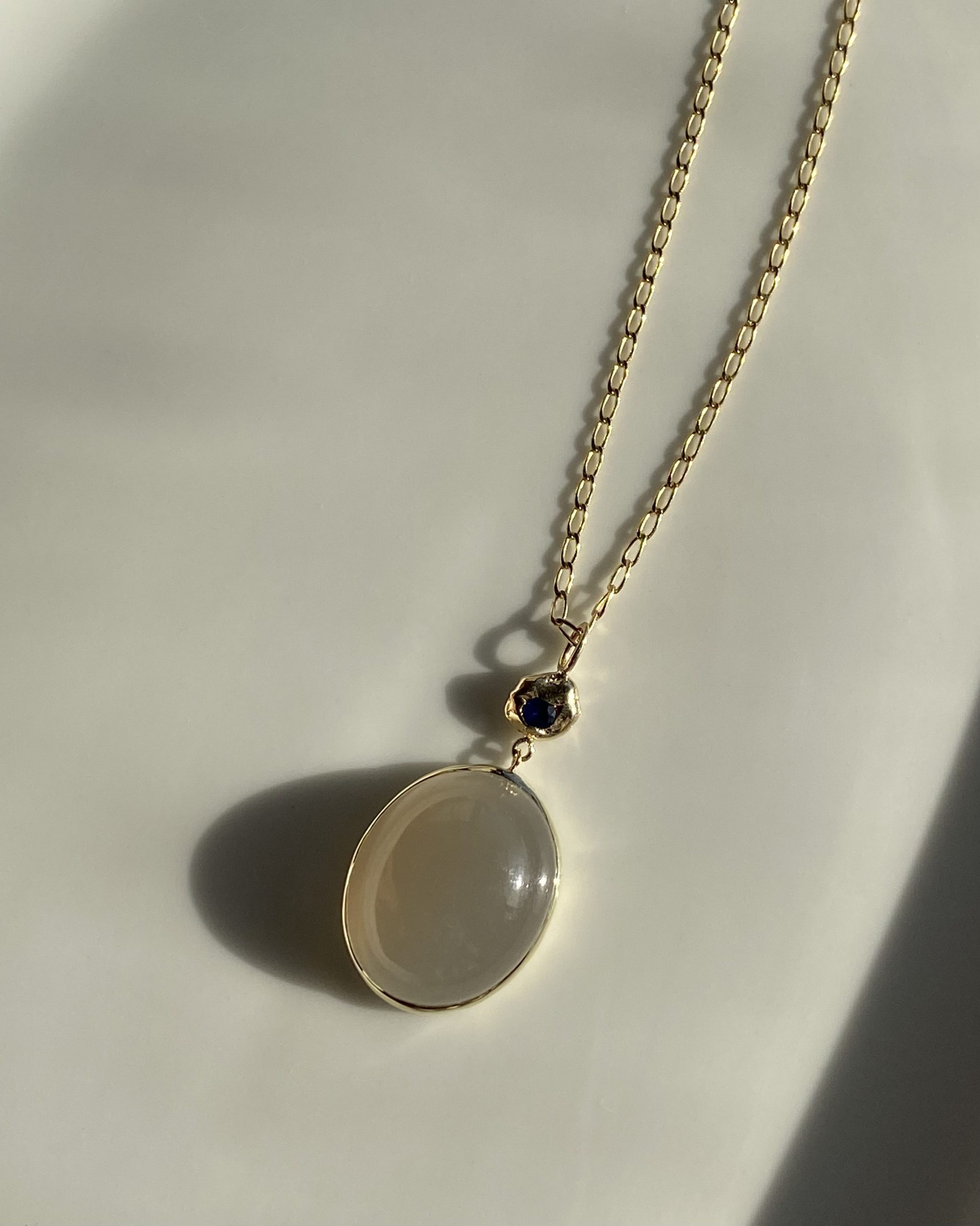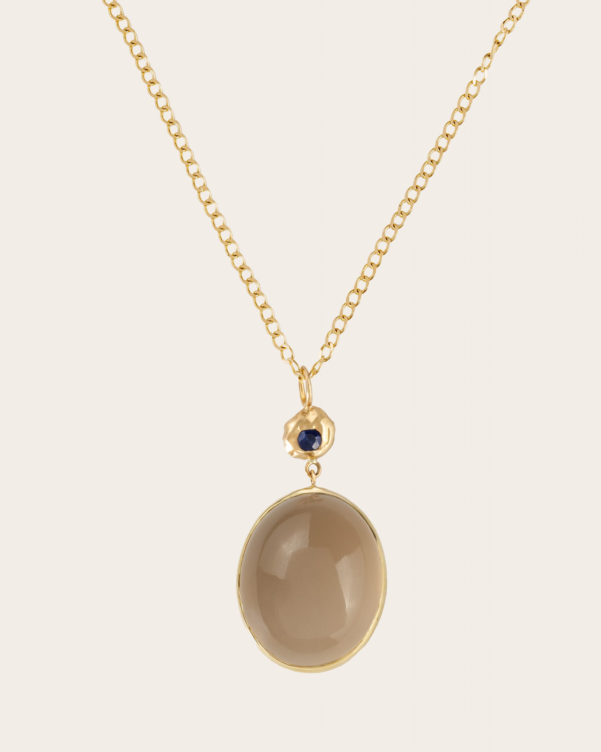 One-of-a-kind hand-fabricated pendant in recycled 14k gold, featuring an oval grey moonstone paired with a round sapphire, set within Rox’s signature hand-sculpted silhouette.